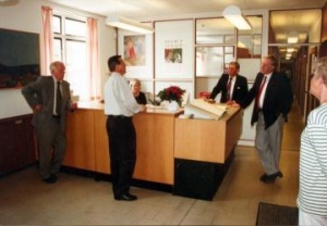 | + | [[Fil: B61837a.jpg|300px|thumb|right|Receptionen på Vejle Stadsarkiv, dengang arkivet lå på Enghavevej 2, Vejle. Stadsbibliotekar Jørn Godrum Bech står yderst til venstre. 1997]] | ||