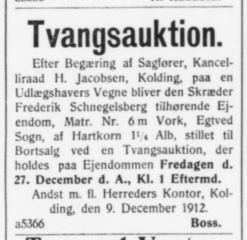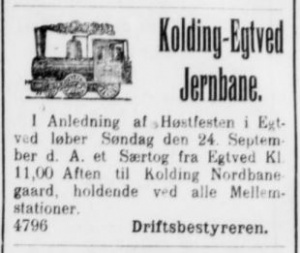 ”Udgiften er anslaaet til 8,700 Kr. Amtmanden: Vi kan vist ikke undgaa den Vej; jeg vil foreslaa, at vi tilbyde Halvdelen, da Egtved allerede har faaet nok paa Nakken i Anledning af Kolding-Egtvedbanen; de har jo saaledes nu opkjøbt alle Undergaranterne. Men jeg skal henstille, om nogen stiller Forslag om andet. Ruge: En Tredjedel kunde vel være nok. Amtsvejinspektøren: Det er over en Fjerdingvej og af et meget vanskelig Terræn. Dall: Hvorfor mener Amtmanden, at vi ikke kan slippe for Tilskud? Amtmanden: Banen er med Vilje lagt med en Bugt imod Syd for at fange denne Del af Egtved Sogn. Eckardt: Kunde vi ikke slippe billigere? Amtsvejinspektøren: Det er et forfærdeligt vanskeligt Terræn. Eskildsen: Det er dog kun en meget lille Del af Egtved Sogn, der faar Gavn af denne Vej. Amtmanden: Ja, men det er en god fed Del. Ruge: Jeg vil foreslaa, at vi nøjes med at tilbyde en Tredjedel; det er allerede et stort Tilskud. - For at yde Halvdelen stemte 5, for en Tredjedel stemte 6”. KF (29.05.1897).
