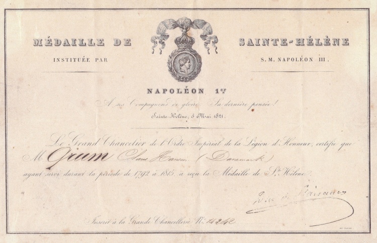 Efter den Kundgjørelse som den franske Regjering har udstædt i danske Blade, at Hs. Majestæt, de franskes Kaiser har indstiftet ”Sct. Helena Medaillen”, endog for fremmede Militaire, som have staaet eller deltaget i den franske Krigstjeneste indtil 1815, tillader undertegnede Claus Hansen Vesterørum, Sindberg Sogn, Veile Amts 76 Lægd, ansat ved fynske Infanteri-Regiments første Bataillin, 7de Compagni No. 30, tjente fra 1807 til i slutningen af Aaret 1815, og har været med ved Slaget for Sehestedt den 10de December 1813 og i Aaret 1814 var indqvarteret i Vestphalen, i Nærheden af den franske Grændse (men Stederne og Navnene have Alderen frataget mig at erindre, ligesom jeg eiheller kan tilveiebringe videre Documentation, end vedlagte Indrollerings- og Afskedspas) sig den underdanigste frihed, at anholde om det Høie Ministeriums Medvirkning til benævnte Medailles Erholdelse, samt om allernaadigst Tilladelse til, at Hs. Majestæt vor danske Konge, ved given Leilighed at bære samme. - Veile, 3’ Marts 1858. Underdanigst Claus Hansen Ørum, Ølbrygger”
