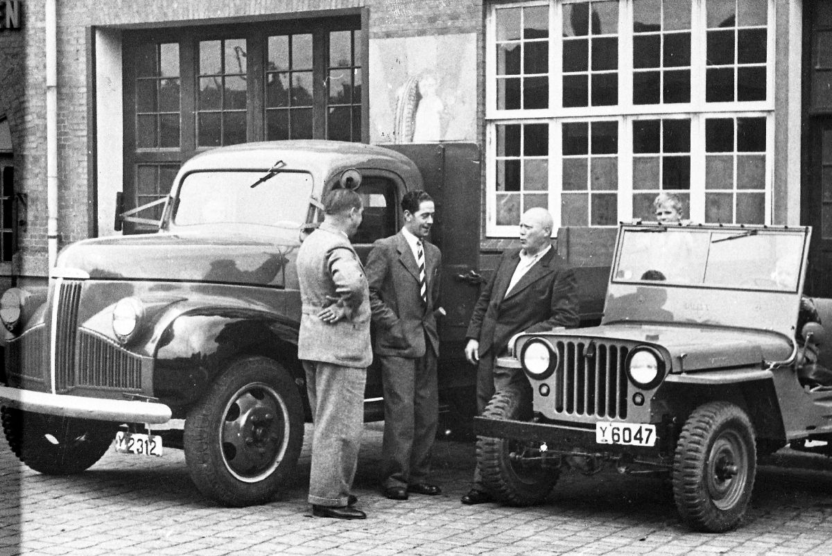 Vejle Autohandel v/ P. Serup Olesen, Borgvold 6, Vejle. Mellem billerne stående fra venstre: Peter Serup Olesen (1905-1957); sælger Harry Nielsen; vognmand Jørgen H. Christensen, Sønderbrogade 40. I jeepen sønnen Henning Serup Olesen. https://arkiv.dk/vis/2470662