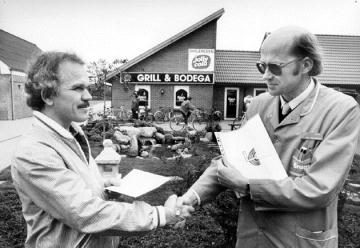 Til venstre bibliotekar Mogens Faber, der ønskes tillykke af brugsuddeler Kai Asmussen med at have vundet Løget Centrets konkurrence om lave et logo til butikscentret. 1986.