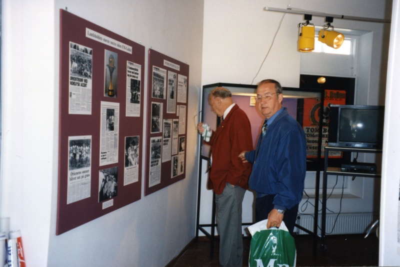 Kulturudvalgsformand Peter Sikær og kulturchef Eigil Jensen på udstilling i Sportsmuseet (Vejle Idrætsmuseum) på Vejle Museum. Ca. 1990