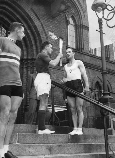 Den olympiske fakkel på Rådhustrappen i Vejle, 29. juni 1952. På trappen foran Vejle Rådhus til venstre cykelrytter Eluf Dalgaard, fodboldspiller Bent Sørensen, Vejle Boldklub, der netop har modtaget den olympiske fakkel af atlet Heinrich Hjort, Vejle Idrætsforening. Eluf Dalgaard fulgte på cykel de følgende atleter med ilden ud ad Vejle via Koldingvej og Kolding Landevej. Ilden blev af stafetter bragt gennem Danmark til Helsingfors (Helsinki) i Finland, hvor De olympiske Lege fandt sted i 1952. Fotograf: Ukendt. B51893